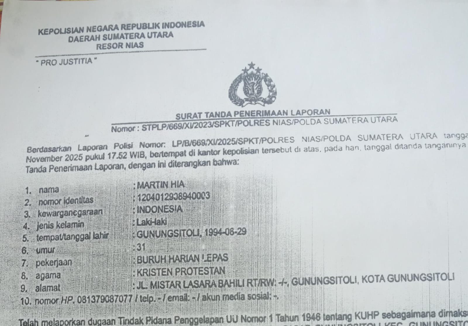 GUNUNGSITOLI/ASIATIMES.ID-Laporan Martin Hia Umur (31) Tahun, Terkait penipuan dan penggelapan Minta Kepastian hukum dari Polres Nias. Rabu 28/01/2026